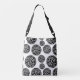This lovely cross-body tote bag is shown in a black and white dots print.