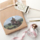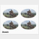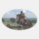 This Oval Sticker features an original digital artwork of a horse and riding jumping over a farm gate, created in Vue by artist Jayne Wilson.