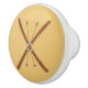Crossed wooden cross-country skis and ski poles on a buckskin background.