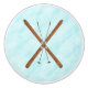 Crossed wooden cross-country skis and ski poles superimposed on a snowy background image.