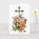 A silver cross with a white border standing in the middle of a whiteand pink tulips and green leaves with a blue haze back ground and isolated on white. The words Trust In the Lord. And He will bless you. Worship with all your heart. He will watch you. Listen to what he says to you. He talks quietly in your ear. Obey his every word. He will teach you much are on the second page of the greeting card