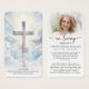 This elegant memorial prayer card features a radiant cross set against a peaceful sky and the editable comforting Bible verse from Matthew 11:28, “Come to me, all you who labor and are burdened, and I will give you rest.” on one side. The other side features your loved one's photo, a modern “In Loving Memory” script design with name and dates and an editable heartfelt prayer. Ideal for funeral services, memorial gatherings or celebration of life ceremonies, this small 3.5x2" keepsake card offers comfort, reflection and remembrance for family and friends to carry as a reminder of their life and spirit. Personalization makes these cards unique.