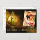 A modern Christian Christmas card design with your family photo and names above a shining glimmering gold Merry Christmas next to a gold Christmas ornament with a reflection of the cross of Christ. You can personalise the backside Christmas greeting, your return address and your names in script near the bottom with space for you to add a handwritten personal note.