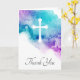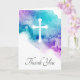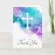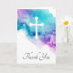 Beautiful sympathy thank you card featuring a white cross on a purple and aqua watercolor splash and the text "Thank you" on the front. Custom text inside: "We are so very grateful for the love and support you have shown us during this difficult time. It is deeply appreciated and will always be remembered"