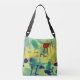 This abstract art bag enlivens your day with its interplay of yellow, blue, and green acting like sunlight and water on a green field.