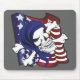 Patriotic skull and crossbones with blue bandanna is set upon the American flag.