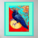 A whimsical design of a crow sitting on a large egg. Painted is southwest colours using turquoise and bold reds. A beautiful and strong nature design. A very decorative art design. This is a show stopper and a must have for lovers of crows. I have painted dozens of crows. My garden is a wildlife sanctuary for birds in general. None are more welcome and appreciated than crows & ravens. There are pillows and coffee mugs available in this store with same images.