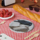 A colour pencil drawing of a curious crow investigating a shiny harmonica he has found adorns these paper plates!