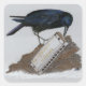 A colour pencil drawing of a curious crow investigating a shiny harmonica he has found.