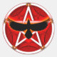 Black crow on a red field and white pagan pentacle with five red subordinate crows with spirals and triple goddess symbols.