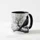 Mug in a black-and-white illustration featuring a sleek black crow perched on a gnarled, leafless branch. The bird's detailed feathers contrast sharply with the stark, skeletal tree limbs, creating a dramatic composition.
