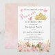 "Our Sweet Little Princess Is Turning Two" "Birthday Party" design featuring gradient uneditable script text for "Princess" with a faux gold glitter tiara crown, pink gradient butterflies and on the bottom faux gold glitter accented pink rose floral borders. Just add party details to complete the design.