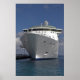 A colour photographic image of a white luxury cruise ship docked against a clear blue sky, and turquoise Caribbean ocean water