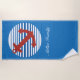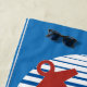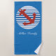 Cruise ship beach towels with red anchor on blue stripes. Add your custom name for your family cruise or event.