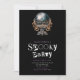 This Halloween party invitation sets a mystical and eerie tone, with its black background and the words "Spooky Party" in a creepy magazine or horror cut-out font in white and purple. The font adds a chilling vibe, perfect for a Halloween celebration. At the centre of the invitation is a black and gold crystal ball, adding an element of mystery and fortune-telling to the design.