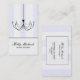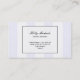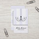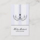 A business card featuring an illustrationof a crystal chandelier hanging from top over a background of light blue vertical stripes. Personalise with your name and job title over sheer section with black trim at bottom. Opposite side is viewed horizonally and features the same background as the front. Personalise with your information over sheer rectangle with black trim.
