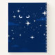 A mesmerizing notebook featuring a majestic white cat (softly detailed, almost dreamlike) stretched across the cover, its fur subtly blending into a starry night sky filled with tiny constellations and a crescent moon.