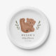 Cute bear theme baby shower paper plate featuring illustration of a cub with green leaves on both sides. Perfect for a shower in the fall for a boy or girl.