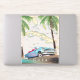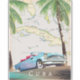 Illustrated map of Cuba (plus surrounding islands) in a beautiful vintage detailed style with a classic old cuban car in the sunset.