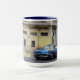 Cuba is known for its vintage American cars.  On this mug a taxi driver waves in Havana, from his old blue Cadillac, polished to shine in Cuban Caribbean sunshine.
