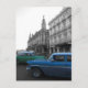 A picture of two vintage American cars parked in Havana in front of the famous hotel Inglaterra. The background is turned to black and white to let the cars stand out more.