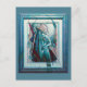 An artwork features a semi abstract woman with a shawl / veil in blue, white, and pink tones.