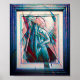 An artwork features a semi abstract woman with a shawl / veil in blue, white, and pink tones.