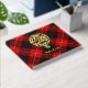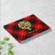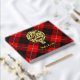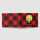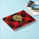 Clan Cunningham crest badge surrounded by a strap and buckle over tartan background. Custom front, back and spine text.