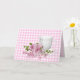 White cup and saucer with pink peonies and rhinestones on pink and white gingham pattern.