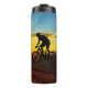 Personalised water bottle with bicycle rider graphic and a sunset background. Add your person's name at the prompt! From HAMbyWhiteGlove aka HAMbWG