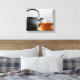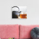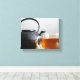 Colour photograph of a clear glass teacup of amber coloured herbal tea next to a black textured metal tea kettle on a table in front of a white wall printed on an 8x10 wrapped canvas. This shot was taken in my Wisconsin studio. A BohippianFinch original photograph.