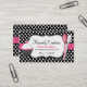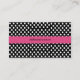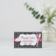 Pretty bakery business card done in a black and white polka dot background, with a pink bold band, across the middle, and a decorative black edged white text area, on the front. Whimsical graphics of pink, white, and black cupcake decorates the left side, of the card and pink and white spoons on the right side. Text is fully customisable to suit your business needs. Great for at home bakers too.