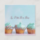 A modern French inspired bakery or pastry chef business card featuring a row of frosted and sprinkles cupcakes and a lovely burgundy script typeface with a rolling pin sketch underneath. The card is a unique square format with a pastel blue green background. Customise on the reverse side of the card with your information.