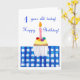 A birthday card for a 1 year old with a candle on a cupcake that is decorated with yellow frosting and coloured sweets, from a handpainted paper collage by Judy Adamson.