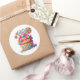 Round sticker is shown with a cute cupcake birthday candy treats print.