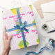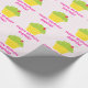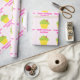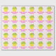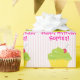 This cute children's birthday wrapping paper features a graphic of a cupcake with bright green frosting and a red cherry. The background is a light pink vertical stripe. Customisable text allows you to add the child's name.