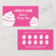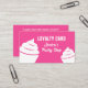 Cupcake pastry bakery loyalty punch card template. Custom company reward card design for cup cake store and more. Customisable hot pink colours. Space for 10 stamps / punch holes. Offer return clients and customers a discount or free order. Two sided print with desserts.