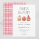 Sweet bridal shower invitation card featuring watercolor illustration of cupcakes with cream and berry. The text says "love is so sweet."