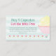 A great rewards program for bakeries or home businesses who sell cupcakes with a fun, whimsical loyalty card design. Whether you sell them in boxes or individually, a loyalty card is a great incentive to get your customers to come back for more delicious cupcakes and baked goods.