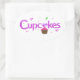 A fun sticker with the word cupcakes and a sweet cupcake design with little hearts in the background.