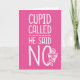 This funny, un-romantic Valentine reads "cupid called, he said NO".