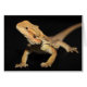 A curious bearded dragon looking forward in front of a black background.