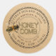 Design features a realistic honeybee just on the edge of the sticker, as if she's wandering over to investigate. Personalise with your business name, address, honeyomb net weight. Kraft background with dotted border.