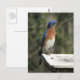 Postcard design features a photograph of a male Eastern Bluebird on top of his nest box.