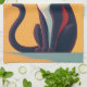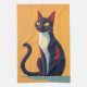 A black and white, retro-looking cat, resembling cats from the 1950's, it's yellow eyes open in curiosity creates a cute and charming kitchen towel.