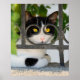 A cute bicolor piebald cat is looking attentively through a wrought iron fence, it seems as though she wears glasses frames. This photographic print on poster paper is a gift idea for pet and cat lovers. Photo taken by Katho Menden on a Greek islands.