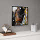 Hey what's up? Sweet and whimsical image of a large brown horse looking through an open window, sticking his head inside. Curious, inquisitive and friendly equine. This big beautiful animal has gentle soft brown eyes wearing a cute orange fuzzy halter. He has perky ears and a long mane and forelock. A tree with yellow, fall coloured leaves can be seen in the background. Wonderful for horse lovers of all types.