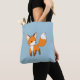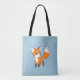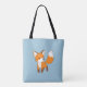 Cute little cartoon fox kit with large ears and bushy tail is standing and looking to the side.