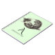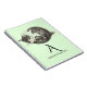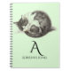Curled up sleeping cat illustration with custom initial and name. Pale green background. A cute notebook or journal for a young child.