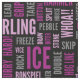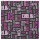 Fabric featuring a pattern of curling terms in sangria purple and grey on black background. Perfect for curlers and curling fans.